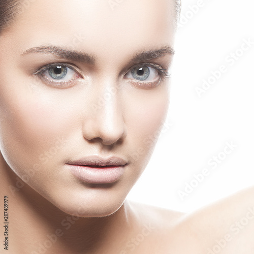 Girl Face Close Up Natural Make Up Clean Skin Blue Eyes White