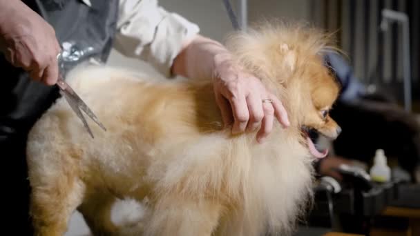 Skilled Groomer Woman Is Cutting Wool Of Fluffy Pomeranian Dog