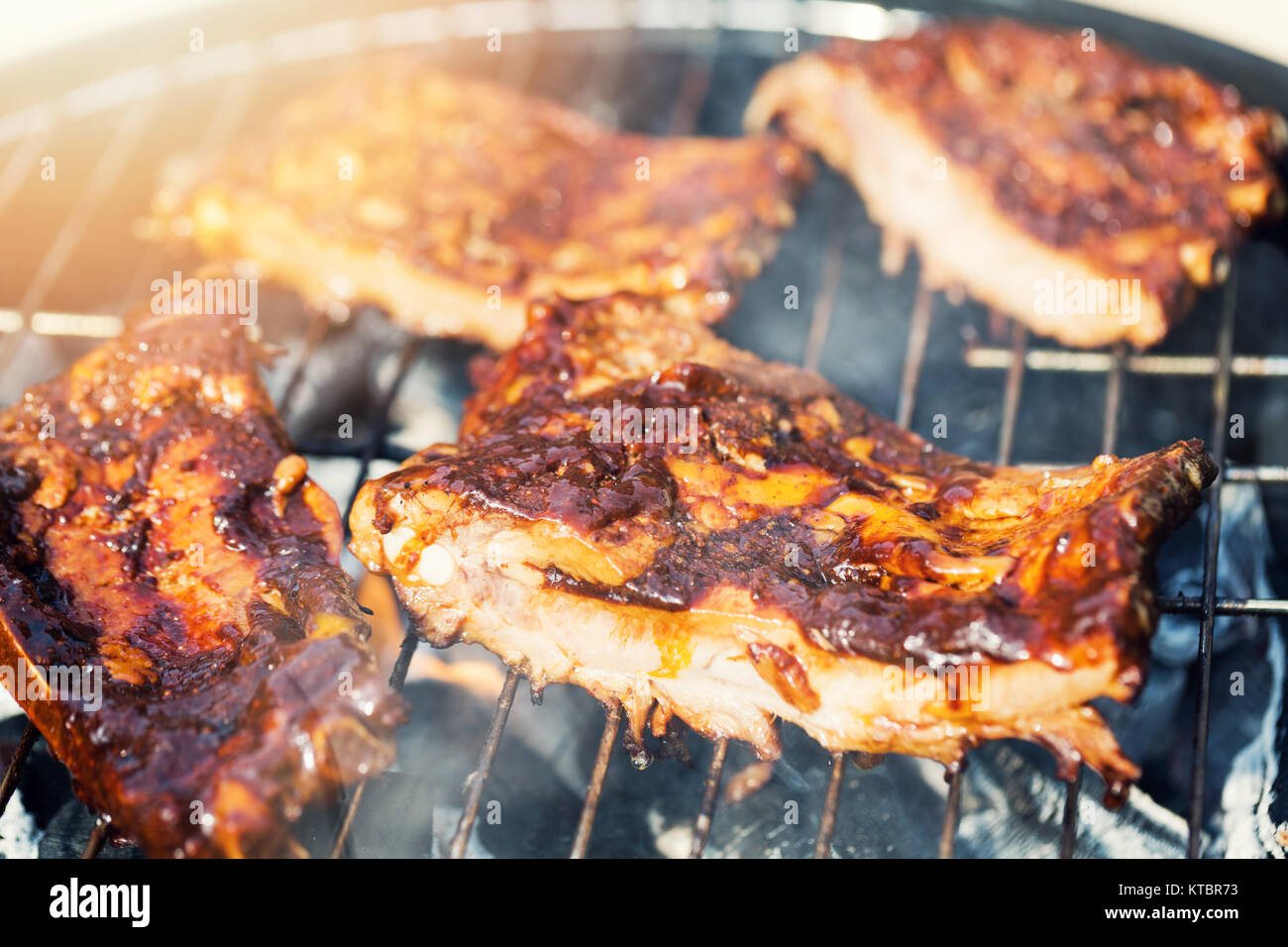 American Bbq Preparing Beef Ribs On Charcoal Grill Stock Photo